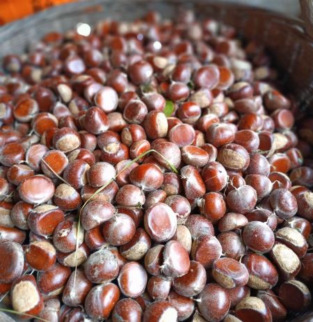 林子里靜悄悄的,只有我們的笑聲和腳下“沙沙”的落葉聲。風(fēng)穿過栗樹枝椏,把毛栗殼的獨(dú)特氣味送過來,混著泥土的腥氣和落葉的腐香,聞著就讓人踏實。布兜漸漸沉了,毛栗在里面相互碰撞,發(fā)出“咕嚕?!钡妮p響,每多一顆,心里的歡喜就多一分。偶爾忍不住捏起一顆,用指甲摳開紅褐色的硬殼,露出嫩黃的果肉,丟進(jìn)嘴里一嚼,清甜脆爽的滋味在舌尖散開,那是大山最直接的獎賞,比任何零嘴都解饞。